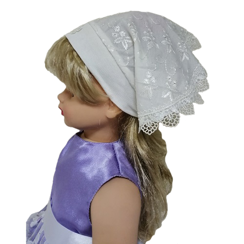 Косынка на трикотажной рибане, без завязок. Одевается как шапочка, но фасон как у косынки. Выполнена из шитья и украшена кружевом.