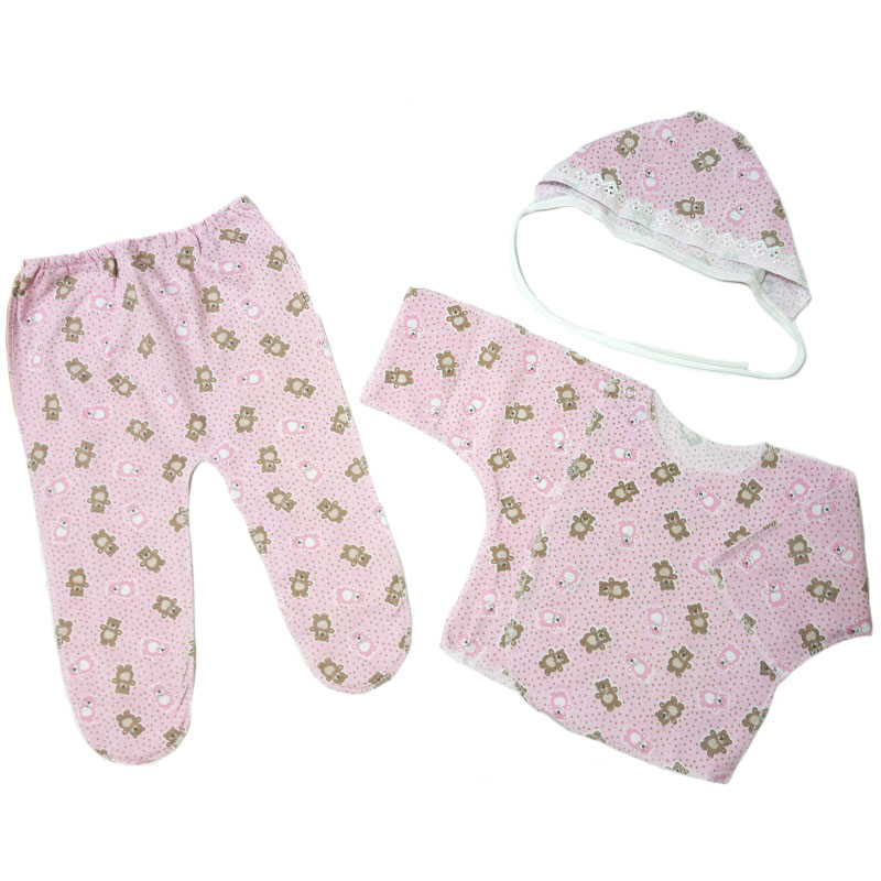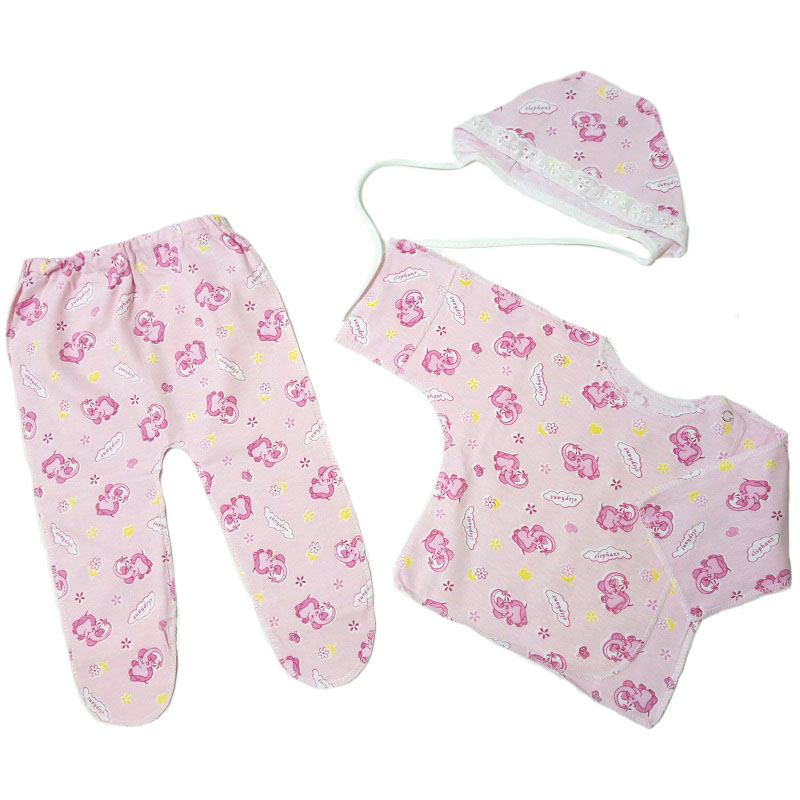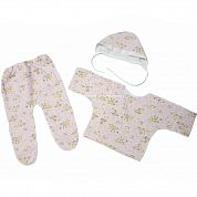 Распашонка с рукавами-трансформерами, с кнопочкой на одной стороне, ползунки на резинке, чепчик на завязках. Все швы у набора выполнены наружу. Рисунки в каждой партии отличаются.